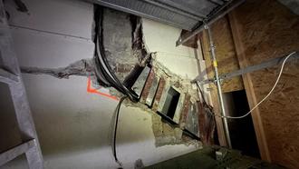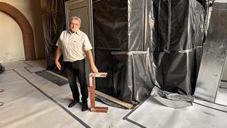 Harald Henrich, Presbyter der protestantischen Kirchengemeinde Lambrecht-Lindenberg, ist nahezu täglich auf der Baustelle und begleitet die Maßnahme. Er ist bestens mit dem Vorhaben vertraut und berichtet von einem Problem, das bei den Vorarbeiten festgestellt wurde. Es geht um einen breiten Lüftungsschacht, der zuerst diagonal und dann senkrecht nach oben zur Empore führt, genau im Bereich des geplanten Durchbruchs. Dieser Lüftungsschacht ist jedoch nicht mehr in Betrieb. Ihn einfach zu entfernen ist nicht möglich, erklärt Henrich, da er unterhalb eines Kreuzrippengewölbes verläuft. Laut statischen Berechnungen lasten dort rund 20 Tonnen Gestein. Sechs Stahlklammern, die damals beim Einbau des Lüftungsschachtes als Stützen eingebaut wurden, tragen davon einen großen Teil dieser Last. Eine dieser Stahlklammern hat sich bereits gelöst. Da jede Klammer für ein Gewicht von einer Tonne ausgelegt ist, müssen die weiteren Arbeiten mit großer Vorsicht ausgeführt werden. Der Statiker hat hierfür aber grünes Licht gegeben, beruhigt Henrich. In den nächsten Tagen wird der Lüftungsschacht vorsichtig entfernt. Der Zwischenraum wird dann von Klammer zu Klammer ausgemauert. Bis dahin dürfen keine Glocken läuten und die Baufirma, die im Außenbereich tätig ist, darf in der Nähe der Wand keinen Rüttler benutzen.