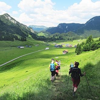Für den letzten Wandertag stand für die Wanderinnen und Wanderer noch einmal eine sehr schöne Wanderung bei einer der größten und vielleicht auch schönsten Vorsäßsiedlungen des Bregenzerwald, der Vorsäßsiedlung Schönenbach, auf dem Programm. Mit dem Bus fuhr man nach Bizau und dann auf der mautpflichtigen Straße bis zum Parkplatz Schönenbach. Während sich die „Kurzwanderer“ auf den Rundwanderweg „Subersach“ begaben, der die Gruppe in knapp zweieinhalb Stunden ohne große Steigungen durch das Tal-Weidegebiet der Vorsäßsiedlung führte, waren für den Rest der Truppe wieder Höhenmeter angesagt. Vorbei am Jagdhaus „Egender“ und an einem Sägewerk ging es stetig bergauf. Vorbei an den Alpen „Vordere Unterspitz“ und „Almisgunten“ erreichte man schließlich die Alpe „Stoggertenn“ auf 1498m. Hier hatte man den höchsten „Einkehrpunkt“ der Wanderung bereits überschritten. Von der Alpe ging es dann immer mit schönen Aussichten auf die hiesige Bergwelt im Blickfeld hinunter zur Alpe „Ostergunten“. Die urige Alpe lud die Gruppe förmlich zum Verweilen ein, obwohl der „Sennwirt“ gerade damit beschäftigt war seine Güllegrube zu leeren. Aber auch dieser „Duft“ gehört zum Landleben dazu. Im Freien sitzend genoss man noch einmal bei typischen Alpspezialitäten den herrlichen Wandertag. Nach der kurzweiligen Rast ging es beschwingt talwärts zum Jagdhaus „Egender“, wo man auch wieder auf die „Kurzwanderer“ traf. Nach einem nochmaligen kurzen Einkehrschwung ging es dann gemeinsam mit dem Bus wieder zurück zum Hotel nach Mellau.