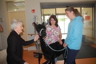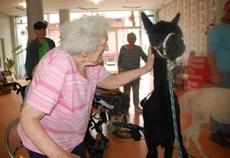 Die Bewohnerinnen staunten nicht schlecht, als der Fahrstuhl aufging und,,Amigo" und,,Blackjack" zu ihnen spazierten. Die beiden Alpakas sind durch ihr friedliches Gemüt für tiergestützte Therapieansätze besonders geeignet. Daher eroberten die wuscheligen Fellnasen schnell die Herzen aller Bewohner*innen. Zu Beginn konnten die zutraulichen, liebevollen und nahbaren Tiere nach Herzenslust gestreichelt und gefüttert werden.