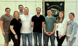 Das neu gewählte Präsidium des FKL von links nach rechts: Andreas Scherf (Passiver Beisitzer), Dominique Ponce-Greß (Sitzungspräsidentin), Maximilian Henrich (Vizepräsident), Adrian Kronen (Geschäftsführender Präsident), Frank Grün (Schriftführer), Maximilian Groß (Schatzmeister), Charlene Karkosch (Aktive Beisitzerin), Lena Scherf (Aktive Beisitzerin)