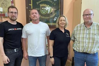 Wechsel der Präsidentschaft beim Fasnachtskomitee „Die Lambrechter Gäsböck“: von links der scheidende geschäftsführende Präsident Tobias Pfeifer, daneben sein Nachfolger Adrian Kronen, die neue Sitzungspräsidentin Dominique Ponce-Greß und ihr Vorgänger Markus Kern.