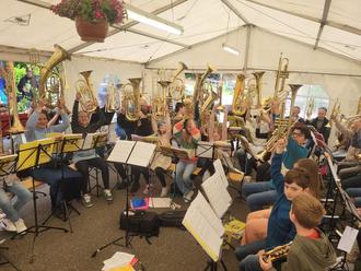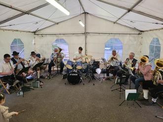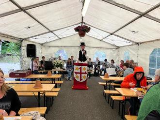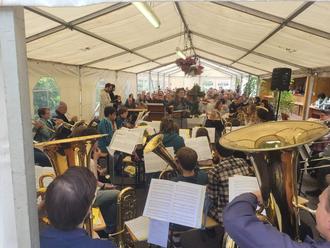 Der diesjährige Kerwemontag fiel auf den Pfingstmontag. Kerwepräsident und Gemeindediakon Matthias Vorstoffel hatte angeregt, den ökumenischen talweiten Pfingstgottesdienst ins Kerwezelt zu verlegen. Rund 200 Gottesdienstbesucher kamen in den Genuss kraftvoller Bläsermusik: 40 Musikerinnen und Musiker des Appenthaler Posaunenchors, darunter auch die Anfänger, spielten gemeinsam mit dem Prot. Posaunenchor Elmstein.