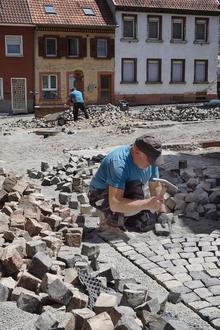 Die Pflasterarbeiten an der ehem. Klosterkirche gehen weiter, handverlesen setzt der Pflasterer einen Stein neben den anderen. Im Vordergrund die fertiggestellte Pflasterung.