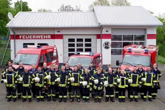 Die Jubel-Wehr vor ihrem Gerätehaus und ihren Einsatzfahrzeugen