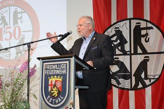 Hans-Ulrich Ihlenfeld, Landrat des Landkreises Bad Dürkheim, blickte auf die Geschichte der Feuerwehren zurück. Vor 150 Jahren bestand die Aufgabe einer Feuerwehr lediglich im Löschen von Bränden. Mit Eimern und kleinen Spritzenwagen stellte man sich damals den lodernden Flammen entgegen. Heute hat sich das Einsatzspektrum einer Feuerwehr zu einem Dienstleistungsunternehmen der Gefahrenabwehr gewandelt. Die Aufgabenstellung hat sich im Laufe der Jahre stark verändert, vom reinen Brandschutz hin zum umfassenden Brand- und Katastrophenschutz. Heutzutage muss sich die Feuerwehr auch mit Starkregen, verbunden mit Hochwasser, Waldbränden und möglicherweise auch Tornadoereignissen auseinandersetzen.