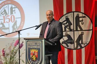 Als Vertreter von Hans-Georg Balthasar, dem 1. Vorsitzenden des Regional-Feuerwehrverbandes Vorderpfalz, der am Abend verhindert war, überbrachte Jochen Hummel die besten Grüße und Glückwünsche. Als kleines Geschenk des Verbandes übergab er der Esthaler Feuerwehreinheit eine kleine goldene Alarmglocke als Dank für die geleisteten Dienste.