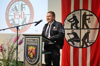 Die Feuerwehr Esthal feiert ihr 150-jähriges Bestehen mit einem mehrtägigen Festprogramm. Am Freitagabend fand ein Festbankett statt mit geladenen Gästen. Wehrführer Torsten Buschlinger blickte bei seiner Willkommensrede in die gut gefüllte Waldfesthalle. 150 Jahre Feuerwehr Esthal mit einer langen Geschichte, ist festgehalten in einer Festschrift, für die besonders Pia Neumann und Tina Defaux verantwortlich waren. Torsten Buschlinger überreichte den beiden Damen je einen großen Blumenstrauß.