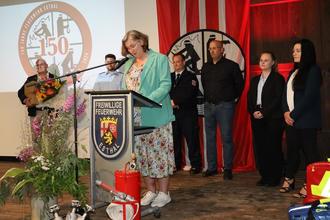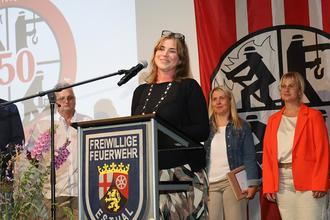Als Sprecherin der ortsansässigen Vereine gratulierte Tamara Baumann der Esthaler Wehr zu ihrem besonderen Jubiläum. Die Gratulation ist auch ein Grund, Danke zu sagen an die Frauen und Männer, die in den vergangenen 150 Jahren gewissenhaft und pflichtbewusst ihre Aufgaben in der Freiwilligen Feuerwehr zum Wohle und zum Schutz der Bevölkerung übernommen haben. Mit Engagement, Mut und fachlicher Qualifikation wurden schon viele Herausforderungen gemeistert. Die Feuerwehr ist ein lebendiger und unverzichtbarer Teil unserer Gemeinde, betonte Baumann. „Ihr alle seid Vorbilder und sorgt dafür, dass das Ehrenamt und der Gemeinschaftssinn lebendig sind und bleiben.“ Tamara Baumann hob die hohe Professionalität der Esthaler Feuerwehr und das große Engagement hervor. „Die Bürger können sich zu 100 % auf euch verlassen.“