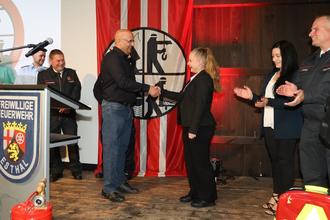 Warum wird man eine Feuerwehrmann oder Feuerwehrfrau, freiwillig und unentgeltlich? Was sind die Gründe hierfür? Diese Fragen hat sich der Wehrführer der Esthaler Feuerwehreinheit Torsten Buschlinger in seiner Begrüßungsrede gestellt und auch gleich beantwortet. Ein Ehrenamt auszuüben, das viel Aufwand erfordert in der Ausbildung, bei den Übungen bei den Einsätzen und teilweise bei Gefahr für die eigene Gesundheit, muss schon bestimmte Beweggründe habe. Vielleicht weil man einen Feuerdrachen bezwingen kann oder ein fettes Feuer niederringen vermag. Weit gefehlt. Es sind ganz andere Motivationen, erklärt Buschlinger. Jeder Feuerwehrangehörige hat das schon erlebt, den Moment in dem man für den geleisteten Einsatz was besonderes zurückbekommt: ein dankbarer Blick, ein nettes Wort oder gar ein fröhliches Lächeln.