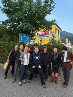 Gruppenbild unter dem frisch geputzten Straßenschild der „Blainviller Straße“ – die Delegation aus Blainville-sur-l’Eau und Gastgeber aus Lambrecht gemeinsam auf dem Weg zur feierlichen Geißbockversteigerung in Deidesheim.