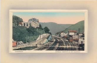 Links im Bild ist die Höhere Webschule zu sehen, rechts der Lambrechter Bahnhof. Das breite Gleisbett der Bahn wurde damals noch an einem Bahnübergang überquert. Von der Hauptstraße – in Höhe der ehemaligen Apotheke Schellbach (Pankratiuskapelle) – führte eine steile Stichstraße, die heutige Apothekergasse, direkt zum Übergang. Auf der gegenüberliegenden Seite des Übergangs setzte sich der Weg mit starker Steigung zum Sommerberg hin fort. Der Bahnübergang fiel erst im Zuge des Baus der Eisenbahnbrücke und der Elektrifizierung der Strecke weg.