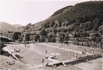 Die Aufnahme zeigt das ehemalige Lambrechter Schwimmbad, das im Jahr 1933 erbaut wurde. Damals bot es im Sommer eine willkommene Abkühlung – nicht nur für die Lambrechter Bevölkerung. Heute existiert das Schwimmbad leider nicht mehr, doch das Foto weckt Erinnerungen an unbeschwerte Sommertage und ein Stück Ortsgeschichte, das vielen noch in lebendiger Erinnerung geblieben ist.