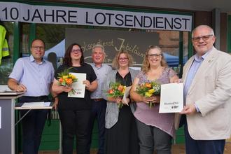 Eine besondere Ehrung erfuhren die drei verantwortlichen Organisatorinnen des Schülerlotsendienste. Von links Schulleiter Thomas Fritz, Lycienne Seibel-Holthey, Jürgen Kemp, Vorsitzender Kreisverkehrswacht DÜW Nord, Tamara Filbrich, Bianca Stuckert und Landrat Hans-Ulrich Ihlenfeld.