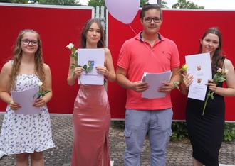 Preise für die besten schulischen Leistungen erhielten Pia Lorenz, Jacqueline Gottschalk, Milosz Grodecki und Emilia Schröder (von links).