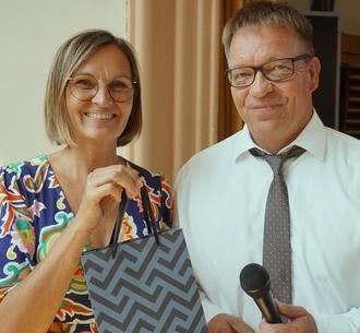 Schulrat Andreas Hüther von der Schulaufsichtsbehörde Neustadt hatte bereits vor zwei Jahren Anke Huber die Ernennungsurkunde überreicht, jetzt brachte er für sie ein kleines Geschenk mit. Der heutige Tag sei ein „besonderer Tag“, wenn die Ernennung zur Rektorin nachgefeiert werden könne, sagte der Schulrat und nannte wichtige Epochen in ihrer schulischen Laufbahn, beginnend mit dem Lehramtsstudium 1987 in Erlangen und dem erfolgreichen Ablegen der beiden Staatsexamen. Es folgten weitere schulische Eckpunkte in Franken mit Aufbaustudien der Schulpsychologie, sie wurde Beraterin für Migrationsfragen und veröffentliche Arbeiten als Unterrichtshilfen. Schließlich kam die Liebe ins Spiel, sie folgte ihrem Freund und verzog von Franken nach Rheinland-Pfalz, wo sie sich im Mai 2020 um die vakante Schulleiterstelle in Lambrecht bewarb. Anke Huber habe in der schwierigen Zeit der Pandemie das Amt übernommen und einen Berg an Arbeit vorgefunden, zudem müsse sie die Grundschule Lindenberg mitführen. Der Schulrat sprach ihr Zuverlässigkeit und Pflichtbewusstsein samt der fachlichen Kompetenz zu. Sie stehe im Dialog mit allen Kolleginnen und Kollegen, mit den Eltern ebenso wie mit dem Schulträger und stehe Neuerungen positiv gegenüber. Grußworte sprachen Sybille Höchel, die 1. Beigeordnete der Verbandsgemeinde Lambrecht als Schulträger und der Lambrechter Stadtbürgermeister Karl-Günter Müller. Mit Seifenblasen und weiteren symbolischen Geschenken wie „Ich schenk dir einen Regenbogen“ beglückwünschten die Kinder musikalisch ihre Schulleiterin.