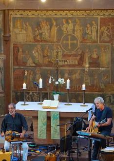 Für nicht alltägliche Klänge in einer Kirche sorgten die Troubadoure Ernst Kaeshammer (Instrumentenbauer aus Fußgönheim) und Paul Reinig (Liedermacher und Komponist aus Landau) mit ihrem mittelalterlichen Konzert „Von Spielleuten, Minnesängern und Troubadouren“ in der ehem. Klosterkirche, der prot. Kirche in Lambrecht im Rahmen der „Sommerlichen Abendmusik“. Bei dem abwechslungsreichen Konzert - zahlreiche Jahrhunderte umfassend - standen neben dem Gesang die mittelalterliche Drehleier, das Hackbrett sowie Trommel und Gitarre im Mittelpunkt, neben Laute und dem Akkordeon des zeitweise dritten Musikers Nicola Polizzano. Die Drehleier ist das seit über tausend Jahre bekannte mechanisierte Streichinstrument, bei dem die Saiten von einem eingebauten Rad angestrichen werden, das mit einer Kurbel gedreht wird. Dabei wird die schwingende Länge der Melodiesaiten mechanisch über Tasten verkürzt, um die Tonhöhe zu verändern.