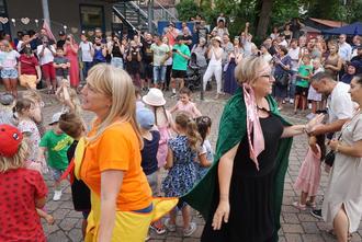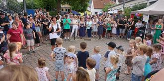 Noch rechtzeitig vor einem kleinen Regenschauer starteten die Kita-Kinder und die Erzieherinnen mit dem Bewegungslieg „Auf dem Rummelplatz“ den kunterbunten Jahrmarkt