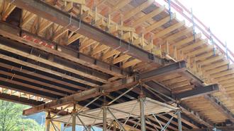 Der untere Brückenabschnitt ist eingeschalt und mit Eisen bewehrt.