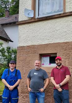 Der erste Funkempfänger in Lambrecht ist installiert: V.l.n.r.: Markus Müller (SWL), Ing. Dinko Ivanov (Geschäftsführer MBN) und Mathias Leininger (SWL) nach der Installation des ersten Funkempfängers am Wohnzimmer-Fenster bei Stadtwerke-Mitarbeiter Markus Müller.