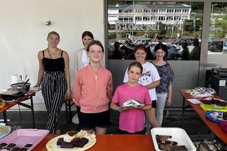 Tänzerinnen der FKL U18 Schautanzgruppe mit ihrer Trainerin Celina Schollenberger (links) beim Kuchenverkauf vor dem SBK