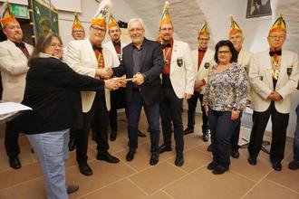 Das Gerangel um den Stadtschlüssel war nur gespielt. Geschäftsführender Präsident Tobias Pfeifer und Sitzungspräsident Markus Kern hatten Stadtbürgermeister Karl-Günter Müller in die Mitte genommen. Die erste Beigeordnete Martina Wode-Buser gibt den Schlüssel gerne frei, während die Beigeordnete Tanja Bundenthal-Beck scheinbar unbeteiligt die symbolische Machtübergabe zusammen mit Mitgliedern des Elferrates beobachtet.