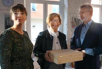 Susanne Becker (Vorstand) und Martin Broeckmann (Vorstandsvorsitzender des AWO-Pfalz-Bezirksverbandes) verabschiedeten Petra Rapp (Mitte) mit einem Präsent in den Ruhestand