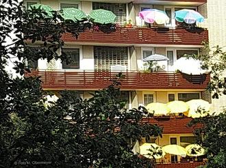 Auf dem Balkon verschafft ein geöffneter Sonnenschirm den Fensterflächen Schatten.