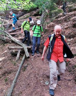 Weiter ging es auf schmalen Pfaden vorbei am Eisenbahnfelsen und den Rauhbergfelsen zur Alpenvereinshütte der Sektion Kaiserslautern. Hier wurde auf den Bänken vor der Hütte erst einmal eine Rast eingelegt. Man hatte sich noch nicht richtig gesetzt, traf auch schon die Wandergruppe aus dem Saarland an der Hütte ein. Sie war etwas später, als vereinbart am Wanderparkplatz eingetroffen. Zwischenzeitlich hatte sich aber die Saarländerin Heike so toll in die „Pfalz-Gruppe“ integriert, dass sie sich dazu entschloss, auch den weiteren Weg mit den „Pfälzerwäldlern“ zu laufen.