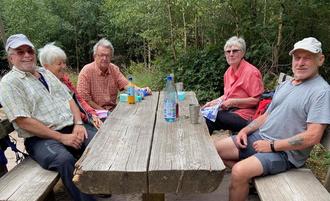 Die Juliwanderung führte die Wanderfreunde der NaturFreunde Ortsgruppe Lambrecht von Edenkoben ins vereinseigene Haus im Kohlbachtal. Das Bild zeigt die Wanderfreunde bei der Rast am Schänzelturm.