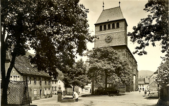 Foto 2: Das Gefallenen-Ehrenmal ist hinter der Friedenseiche an der Turmmauer zu erahnen