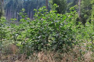Die Bäume sind gut angewachsen, doch die invasive Kermesbeere hat sich im ganzen Hang angesiedelt und nimmt den jungen Bäumen zunehmend das Licht. Jede Pflanze der Kermesbeere verteilt unzählige Samen, so dass schnell ein Dickicht entsteht und den jungen Bäumen das Licht fehlt.