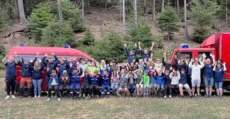 Das Foto vermittelt die Freude der Kinder, Jugendlichen und der Betreuer des ersten Zeltlagers der Kinder- und Jugendfeuerwehren der Verbandsgemeinde Lambrecht.