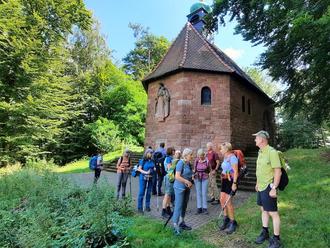 Lambrecht. (wk) Um kurz nach „Neun“ machten sich 14 Wanderer/innen von Lambrecht aus mit der S-Bahn auf zur „Sickingenstadt“ Landstuhl. Den Namensbestandteil „Sickingenstadt“ trägt die Stadt Landstuhl seit dem 14. Juli 1995. Vom Bahnhof aus führte Wanderführer Gerd Scherer die Wandergruppe nach einem kurzen Anstieg und „Gegenabstieg“ über einen Waldweg erst einmal durch seine Heimatstadt Landstuhl. Kurze Erläuterungen und Erklärungen an historischen Gebäuden rundeten die kurze Führung ab.
