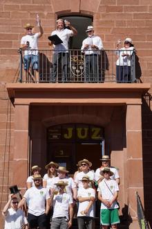 Im Mittelpunkt der 571. Lambrechter Gäßbock-Kerwe stand die Kerweredd, die Markus Bialas vom Balkon des Hauses der Vereine hielt. Auf der Treppe positionierte sich die Kerwe-Jugend.