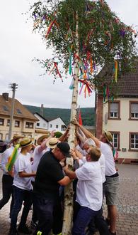 Am Kerwegrab in der Mühlstraße ließ Kerweredner Markus Bialas mit lautstarker Unterstützung die Kerwe „hoch leben“ und gab eine in Reime gesetzte Vorschau auf die vier Kerwetage. Vom Kerwegrab aus wurde der Kerwebaum „für alle“ geschultert und zum Herzog-Otto-Platz getragen, wo die geschmückte, knapp zehn Meter hohe mit farbigen Bändern geschmückte Birke unter vielfältigem Beifall aufgestellt wurde. Stadtbürgermeister Karl-Günter Müller schwang den Hammer und schlug mit einem gezielten Schlag das von Maximilian Henrich spendierte Fass Freibier an. Schnell waren die Gläser gefüllt und man ließ die 571. Lambrechter Gäßbock-Kerwe „hoch“ leben.