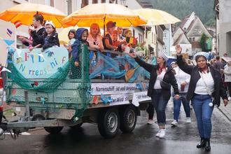 Ein farbenfroher Kerwe-Umzug zog sich trotz des trüben Wetters durch die Lambrechter Straßen und erfreute die Zuschauer am Straßenrand. Hier das Narrenschiff des Fasnachtskomitees „Die Lambrechter Gäsböck“.