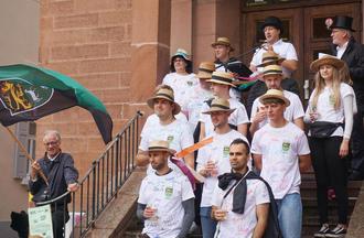 Sie standen im Mittelpunkt der 572. Lambrechter Gäsbock-Kerwe, die Kerwejugend mit Kerweredner Markus Bialas, dem Kerwe-Ausgraber Niklas Brombacher und der Stadtspitze mit der Beigeordneten Tanja Bundenthal-Beck und Stadtbürgermeister Karl-Günter Müller (obere Reihe).