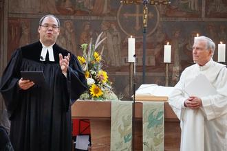 Pfarrer Martin Groß und Gottesdiensthelfer Heiner Oppermann gestalteten zusammen mit dem Posaunenchor Hambach-Winzingen den ökumenischen Kerwe-Gottesdienst. Die beiden Geistlichen führten ein köstliches „Streitgespräch“ zwischen einer Kirchenbank und einer Festzeltbank in Mundart und Hochdeutsch.