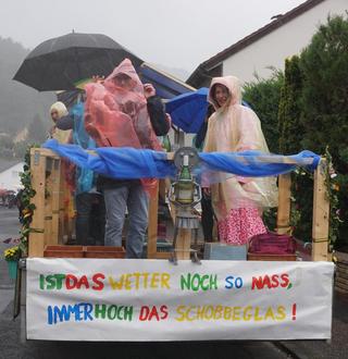 Dieses Bild vom Festwagen des Vereins der Garten- und Blumenfreunde spricht Bände: Gut gegen den Regen geschützte Aktive auf dem Festwagen und den passenden Slogan dazu am Heck des Wagens: „Ist das Wetter noch so nass, immer hoch das Schobbeglas!“