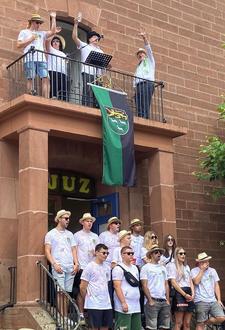 Vom Balkon am Haus der Vereine herunter hielt Markus Bialas seine vielbeachtete Kerweredd. Auf der Treppe zeigte sich die Stadtjugend.