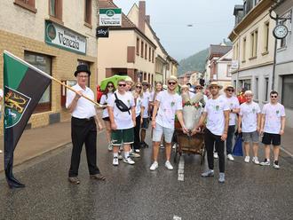Angeführt wurde der Zug vom Fahnenträger, gefolgt von der Kerwejugend, dem Kerwe-Komitee mit „Kerwe-Managerin“ Tanja Bundenthal-Beck, dem Stadtrat, dem Kerwe-Redner sowie dem alten und dem neuen Stadtbürgermeister, die gemeinsam den blumengeschmückten Korb mit der ausgegrabenen Kerwe, einer Weinflasche, zum Kerwe-Platz trugen trugen.