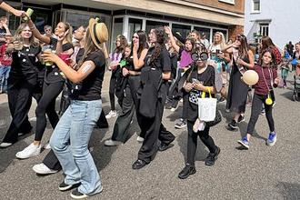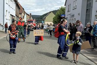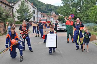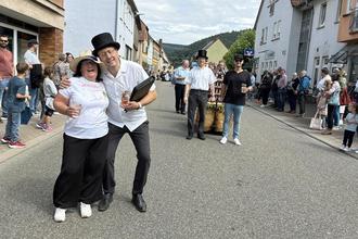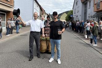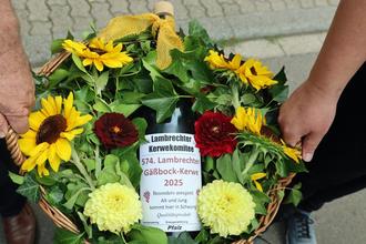 Für ein sicheres Geleit sorgte die Feuerwehr, die den Zug begleitete und absicherte. Angeführt wurde der Umzug vom Fahnenträger Hans Denig, gefolgt von der Kerwejugend, dem Kerwe-Komitee rund um „Kerwe-Managerin“ Tanja Bundenthal-Beck, dem Stadtrat, dem Kerwe-Redner Markus Bialas, Stadtbürgermeister Andreas Ohler sowie dem Geißbock-Brautpaar 2025, Lisa und Michael Müller. Einen besonderen Akzent setzten Pfarrerin Sarah Schulze und Stadtrat Robert Westerberger, die gemeinsam den blumengeschmückten Korb mit dem Kerwe-Symbol – einer Weinflasche zur 574. Lambrechter Kerwe – trugen.