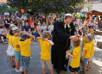 Die elf Schulabgänger standen im Mittelpunkt des Sommerfestes, sie präsentierten sich im Dschungel, hatten Abenteuer zu bestehen und schließlich war auch noch Pfarrer Martin Groß beteiligt, der den Kindern den richtigen Weg aus dem Dschungel zeigte. Mit Handauflegen segnete er jedes der künftigen Schulkinder, mit Gott an der Seite seien sie stets beschützt. Die Erzieherinnen packten die Kinder nacheinander und unterstützten sie bei ihrem Sprung „aus der Kita in die Zeit der Schule“, wobei sie sicher auf den Sprungmatten landeten. Anschließend erhielten sie ihre Schultüten und persönliche Erinnerungen an ihre Kindergartenzeit und gleichzeitig war das Sommerfest mit zahlreichen Spielen, samt einer Tombola, eröffnet. Ein Luftballonkünstler brachte mit seinen Luftballonfiguren die Kinder zum Staunen.