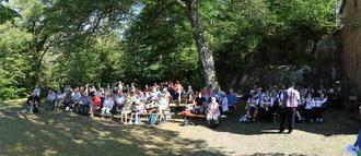 Zahlreiche Besucher beim Festgottesdienst. Rechts der Musikverein Esthal
