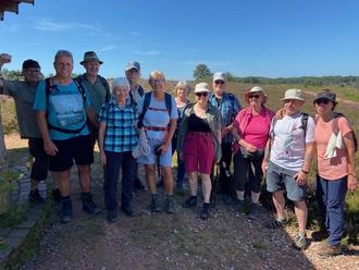 Auf breiten Wegen durch einen schönen, Schatten spendenden Buchenwald, wanderten die Teilnehmer Richtung Mehlinger Heide. Nun noch einem schmalen Pfad folgend und der Wald macht der Heide Platz. Der weitere Weg führte durch die blühende Heide zur Aussichtsplattform auf der „Höhe 325“. Von hier hatten die Wanderfreunde einen herrlichen Blick auf die Heide.