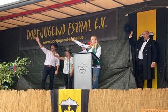 Angeführt wurde der Zug von Dorfbüttel Helmuth Eisenhauer, der traditionell mit seiner Schelle die Aufmerksamkeit der Zuschauer auf sich zog. Direkt dahinter marschierten die Kerwe-Mädels Tanja und Maren mit dem Begrüßungsschild, gefolgt von der Esthaler Ortsfahne, die stolz von Alexis, Jonas und Jan getragen wurde. In diesem Jahr hat sich Rainer Pfeifer aus Wiesbaden, der sich als Ureinwohner Esthals verkleidet hat, erstmals am Umzug beteiligt. Den Klang der Highlands hat Dudelsackspieler Christian Sorg mitgebracht, während die Kerwe-Jugend mit prächtig geschmückten Kerwe-Bäumen das Bild abrundete.