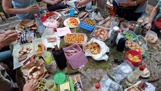So startete man schon früher als gewohnt um 9:00 Uhr am Friedhof in Lambrecht auf dem Rundweg Nummer 3. Vorbei an der „Bank von der Tante“, der Nollenboll und der „Stadter Bank“ erreichte man die „Schöne Aussicht“ (Wildsaukopf). Hier gab es die erste längere Trinkpause mit schöner Aussicht auf Lambrecht. Nachdem der Flüssigkeitshaushalt wieder aufgefüllt war, folgte man weiter der Markierung Nummer 3 zum „Runden Tisch“. Hier legte man jetzt die Mittagsrast am schattigen Platz mit großem Buntsandsteintisch und Sitzgelegenheiten ein. Jeder fand einen Sitzplatz und das Mitgebrachte wurde aus dem Rucksack ausgepackt.
