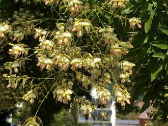 Der Perlschnurbaum ist nicht nur ein Zierdebaum, sondern auch ein wichtiger Spätblüher für Insekten. Seine gelblich-weißen Schmetterlingsblüten, bis zu 30 Zentimeter lang, hängen in verzweigten Trauben von den Ästen und bieten eine wertvolle Nahrungsquelle, wenn andere Bäume längst verblüht sind. In diesen Tagen summt und brummt es in seiner Krone ununterbrochen – unzählige Bienen, Hummeln und andere Insekten tummeln sich im Blütenmeer. Zudem gilt er als besonders hitze- und trockenheitsverträglich – Eigenschaften, die ihn in Zeiten des Klimawandels zunehmend interessant machen.