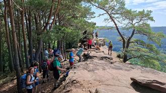 Vom Parkplatz kurz vor dem Ortseingang von Dimbach startete die Wanderung. Gleich von Anfang an ging es in die „Vollen“. Schon die ersten Anstiegsmeter ließen erahnen was auf die Wandergruppe zukommt. In stetigen auf und ab ging es über den Dimberg und Rötzenberg, vorbei an bizarren und eindrucksvollen Sandsteinkolossen mit Namen Falkenstein, Hoher Kopf, Isselmannsteine, zum tollen Aussichtspunkt Rötzenfelsen (Rötzensteinpfeiler). Dessen gewaltigen Ausmaße konnte man erst richtig wahrnehmen, als man ihn auf der weiteren Wanderung von der gegenüberliegenden Seite in Augenschein nehmen konnte. Vom Rötzenfelsen bot sich der Wandergruppe eine weitreichende Aussicht zur Ruine Lindelbrunn, über den westlichen Wasgau, bis zu den am Horizont aufragenden Berge der Nordvogesen.