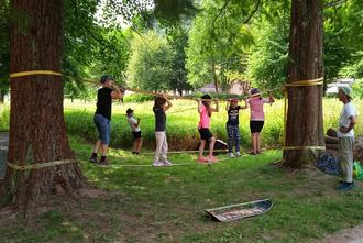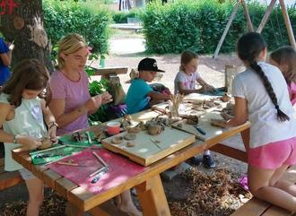 Von Montag-Freitag jeweils von 8.00 bis 14.30 Uhr war ein interessantes Programm vorbereitet. Gemäß dem Ablauf-Motto „5 Tage, 5 Gruppen, 5 Angebote“ waren die Gruppen in der ersten Woche mit Bus/Bahn (9-Euro-Ticket) oder zu Fuß in Begleitung pädagogischer Fachkräfte und ehrenamtlichen MitarbeiterInnen täglich abwechselnd zum Mußbacher Schwimmbad, mit zwei Gruppen im Park in Elmstein (Teamspiele und Trommelworkshop), auf dem Waldspielplatz in Lindenberg und zu Kunst- und Kultur (mit Lehm-Werkstatt und musikalischem Rhytmusangebot) an der Grundschule/Spielplatz Weidenthal unterwegs. Überall wurde programmatisch Wert auf Teamspiele gelegt, um das Miteinander zu fördern. Zeit zum Spielen oder Chillen war überall auch noch.